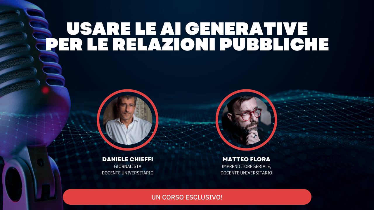 In questo corso, Matteo Flora e Daniele Chieffi ti insegneranno come utilizzare le AI Generative come GPT, Midjourney e Dall-e per migliorare le tue competenze nelle relazioni pubbliche e aumentare la tua velocità di esecuzione.